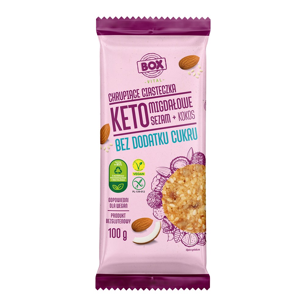 Mąka MIGDAŁOWA 27%, substancja słodząca: maltitol, ziarno SEZAMU 20%, ziarno słonecznika, błonnik z korzenia cykorii, olej rzepakowy, wiórki kokosowe 3%, emulgator: lecytyna z rzepaku, aromat naturalny.